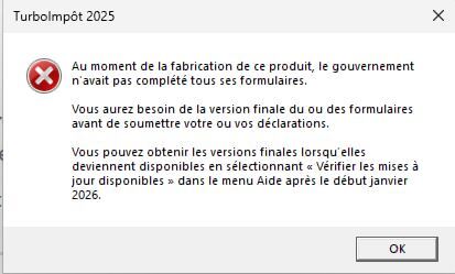 Nous déployons tous les efforts pour finaliser tous les formulaires fiscaux afin de répondre aux exigences de l’Agence du revenu du Canada (ARC) et de Revenu Québec (RQ). Certains de ces formulaires ne sont pas encore prêts dans TurboImpôt.